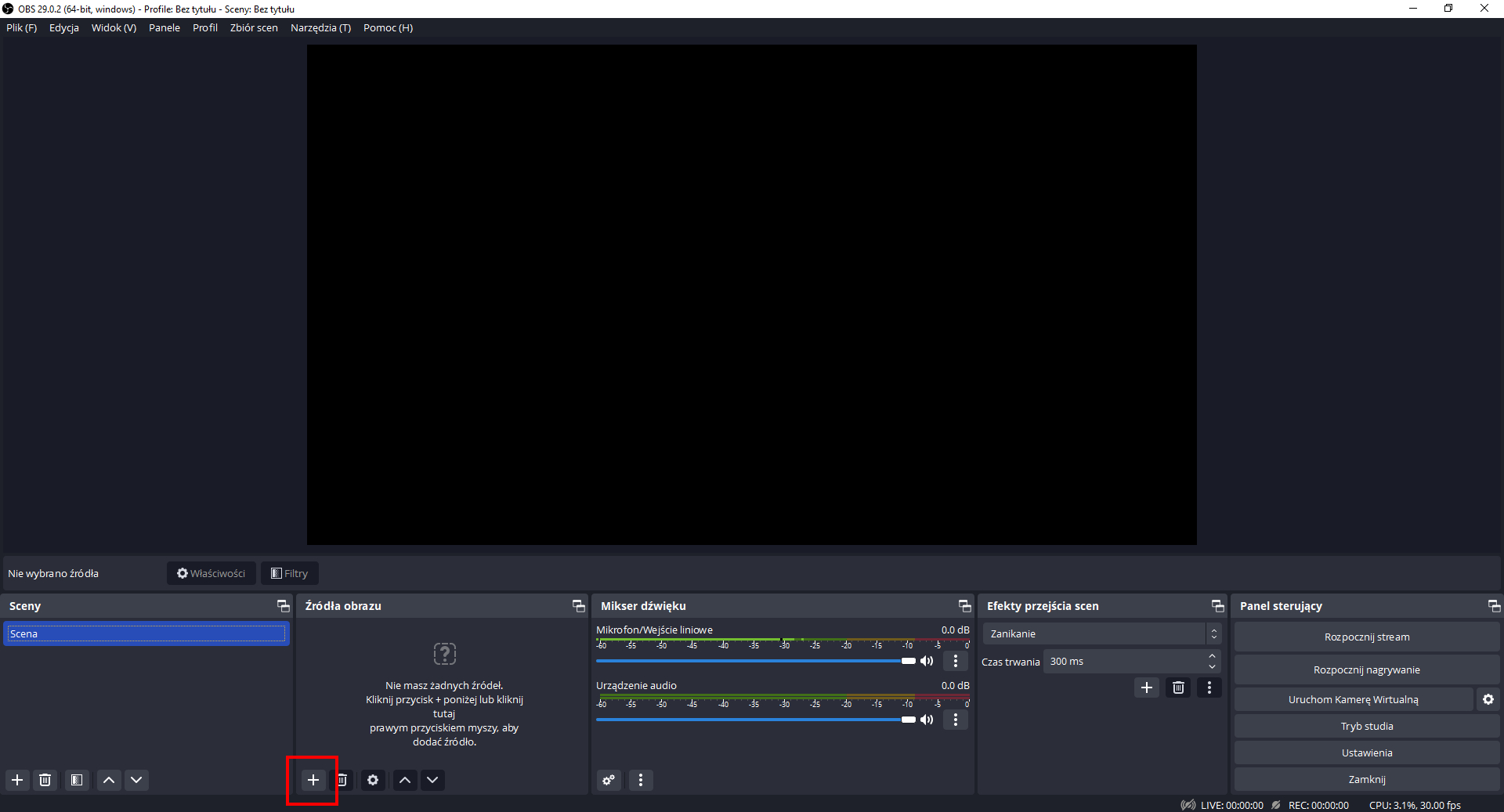 Po poprawnym skonfigurowaniu Grabbera, czas przejść do ustawień programu OBS Studio. Na początek instalujemy program, po czym przechodzimy do głównego okna. W dolnych zakładkach programu odnajdujemy okienko „źródło obrazu” w którym klikamy na przycisk „+”.