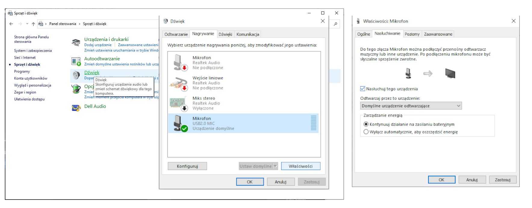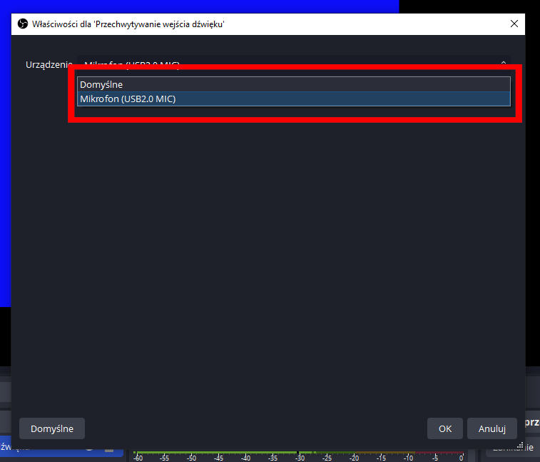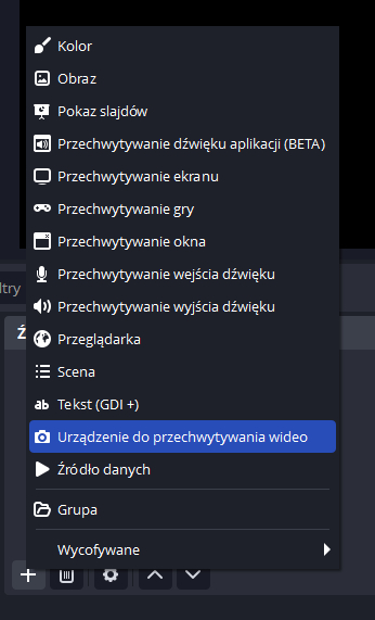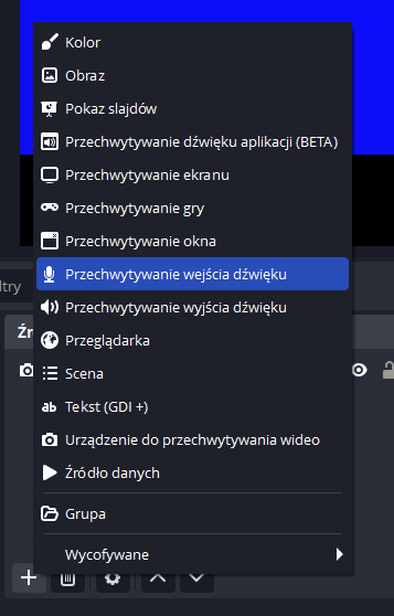 - Ustawienia dźwięku: Ponawiamy krok z kliknięciem w „+”. Tym razem z listy wybieramy opcję „Przechwytywanie wejścia dźwięku”, ustawiamy nazwę i wybieramy ponownie nasze urządzenie.