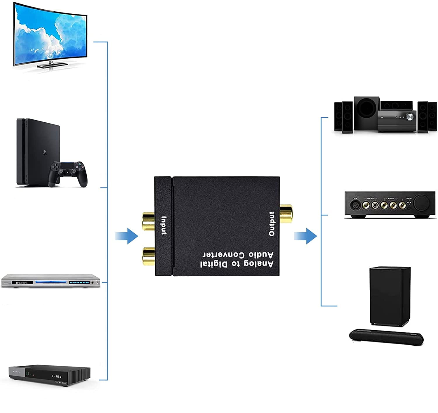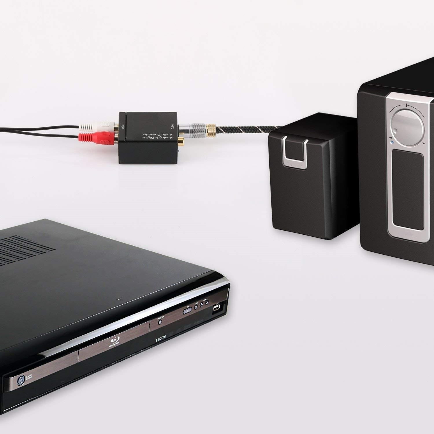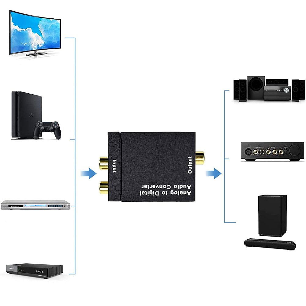Konwerter pozwala na podłączenie urządzeń z analogowym wyjściem audio do cyfrowych wzmacniaczy dźwięku. Konwerter działa jak DAC i zamienia sygnał analogowy na cyfrowy do złącza optycznego Toslink oraz elektrycznego Coaxial. Połączenie telewizora, komputera, telefonu lub odtwarzacza mp3 do amplitunera lub zestawu kina domowego wreszcie jest możliwe. Konwerter działa na zasadzie Plug&Play i wymaga tylko podłączenia kabli.