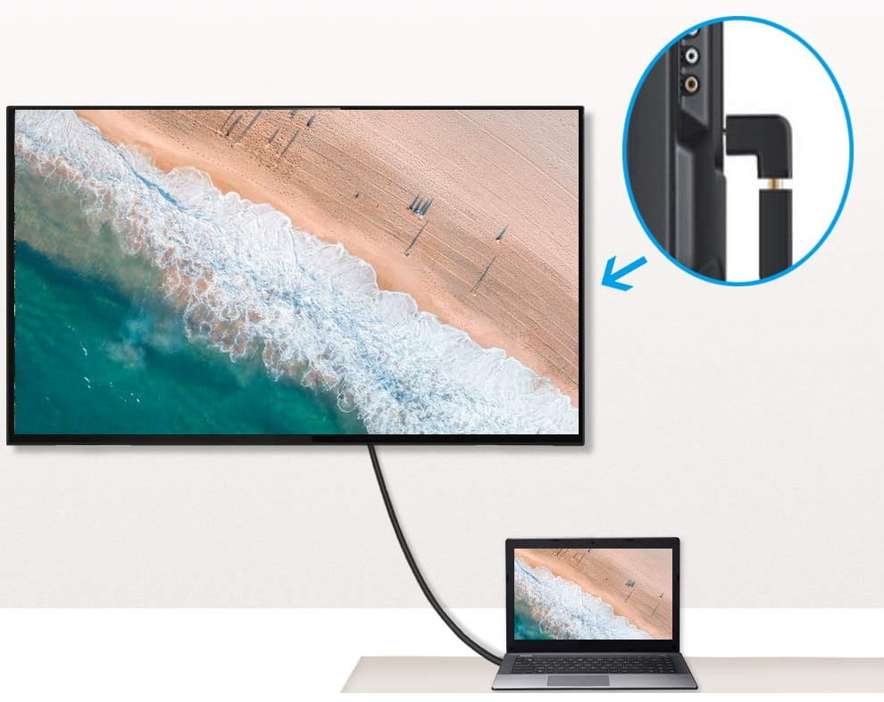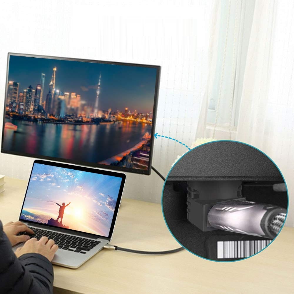 Do HDMI telewizora/monitora podłączamy adapter dzięki czemu możemy poprowadzić kabel do komputera bez zginania czy większych problemów.
