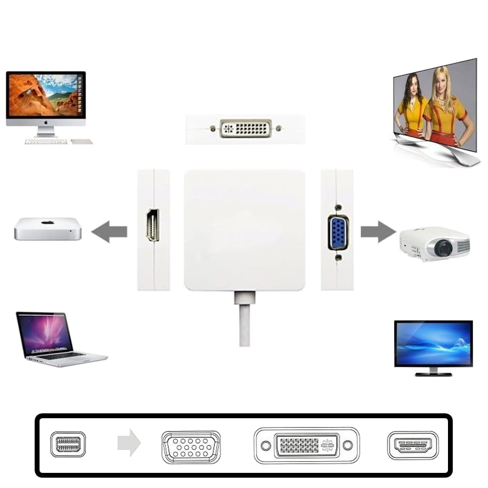 Konwerter umożliwia podłączenie laptopa / komputera PC / iMac / Mac Book Pro z wyjściem mini DisplayPort do monitora / telewizora / projektora z wejściem DP / DVI / HDMI.