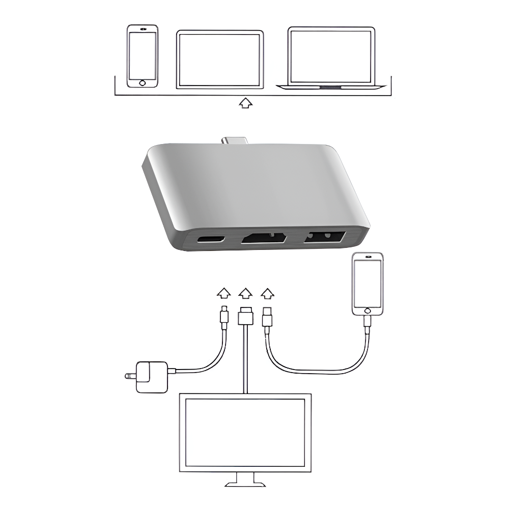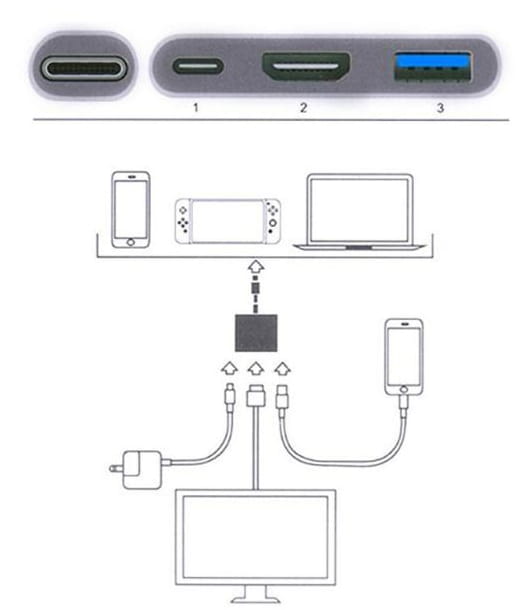 Do urządzenia z wejściem USB-C 3.1 podłączamy adapter. Bez konieczności instalowania jakichkolwiek sterowników możemy korzystać z USB 3.0 podłączając mysz/klawiature lub pendrive. Ze złącza HDMI prowadzimy kabel do monitora/telewizora na który chcemy udostępnić ekran. A złączem żeńskim USB-C zapewniamy urządzeniu zasilanie.
