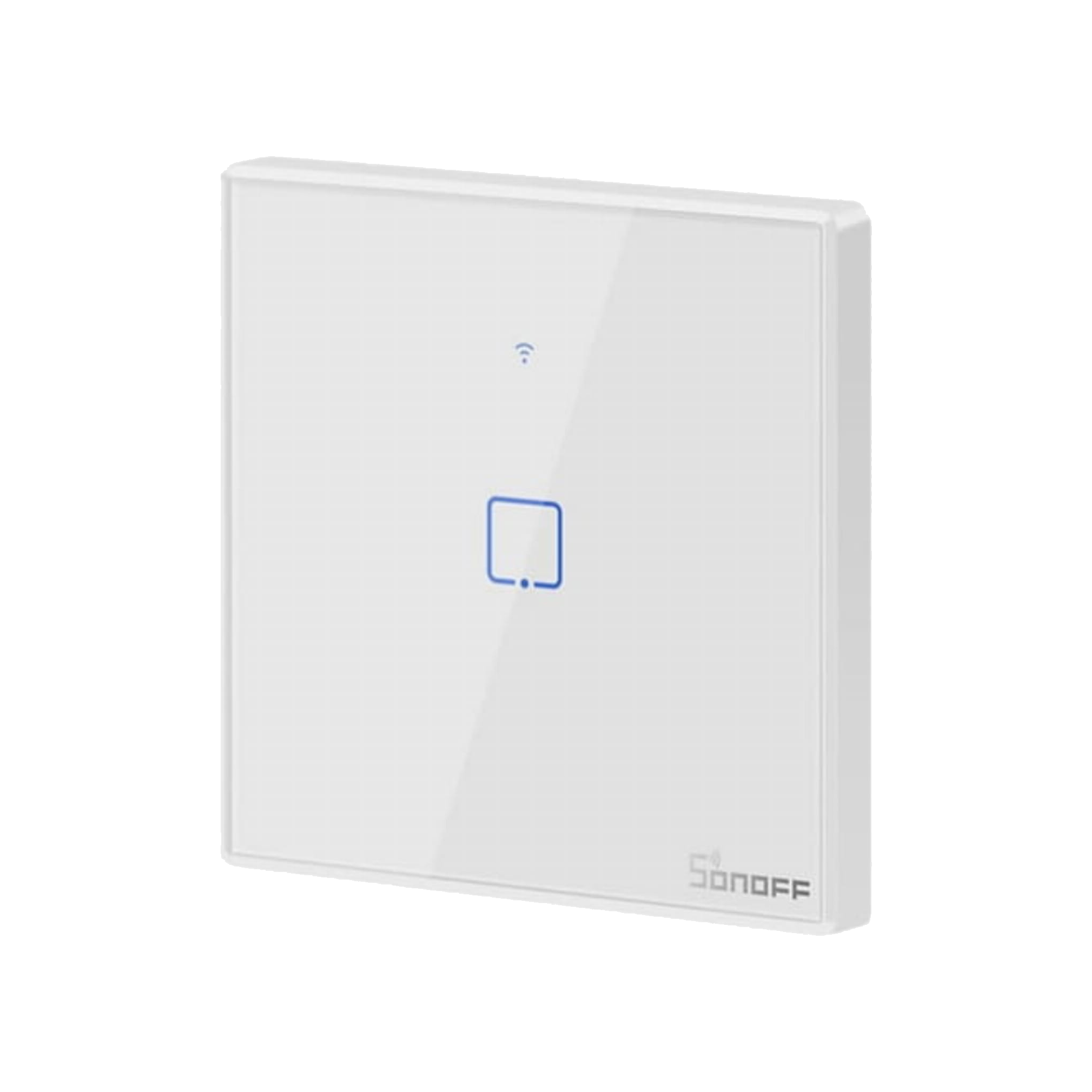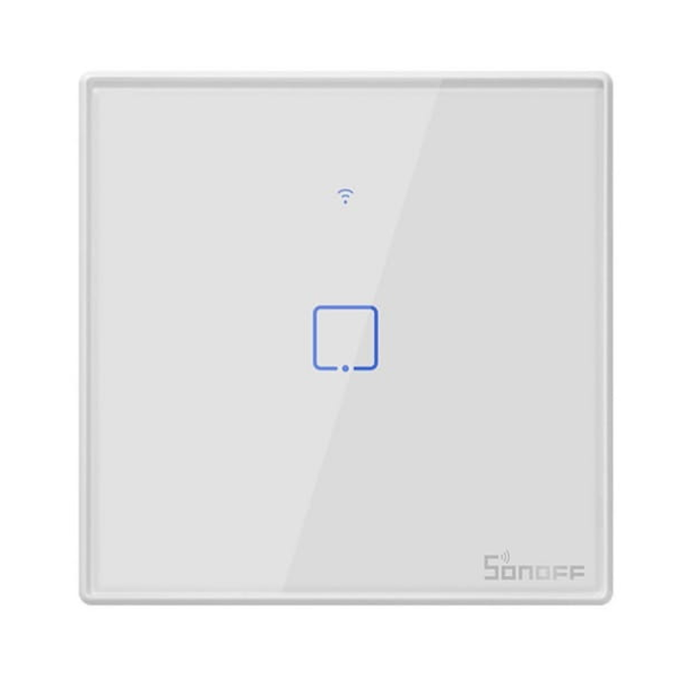 Jednokanałowy włącznik dotykowy Sonoff TX T2 z białym szklanym frontem. Sterowanie za pomocą panelu dotykowego, WiFi i pilota RF