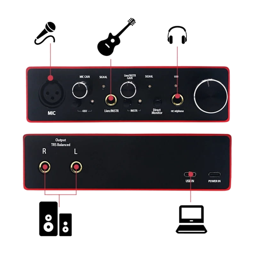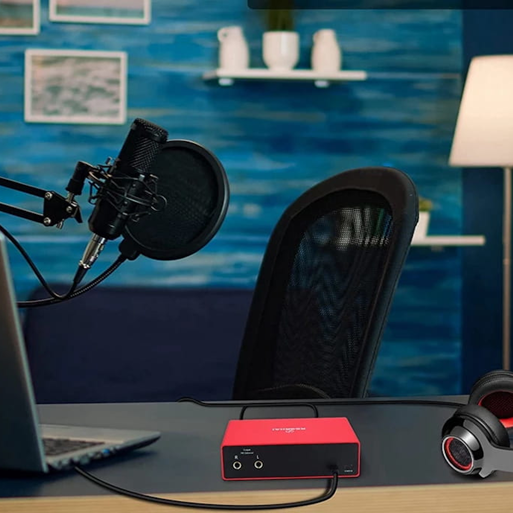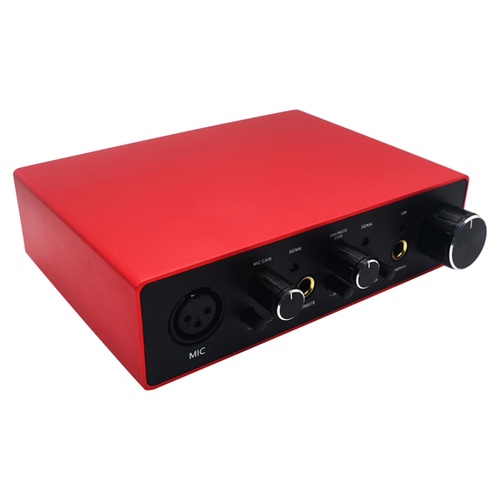 Interfejs audio USB (zewnętrzna karta muzyczna), to świetne urządzenie, zarówno dla początkujących jak doświadczonych muzyków. Podłącz mikrofon, gitarę lub inny instrument i zacznij tworzyć. Kompatybilny z popularnymi programami do nagrywania, Avid pro, Ableton live, Cubase itp. Maksymalna częstotliwość próbkowania: 48 kHz 16BIT Obsługa mikrofonu kondensatorowego 48 V, wzmocnienie większe niż 23DB, maksymalna obsługa wejścia sygnału 2VRms. Współpracuje z systemem Windows, iOS, oraz Android. Przesyła strumieniowo 2 wejścia / 2 wyjścia z bardzo niskim opóźnieniem do komputera.