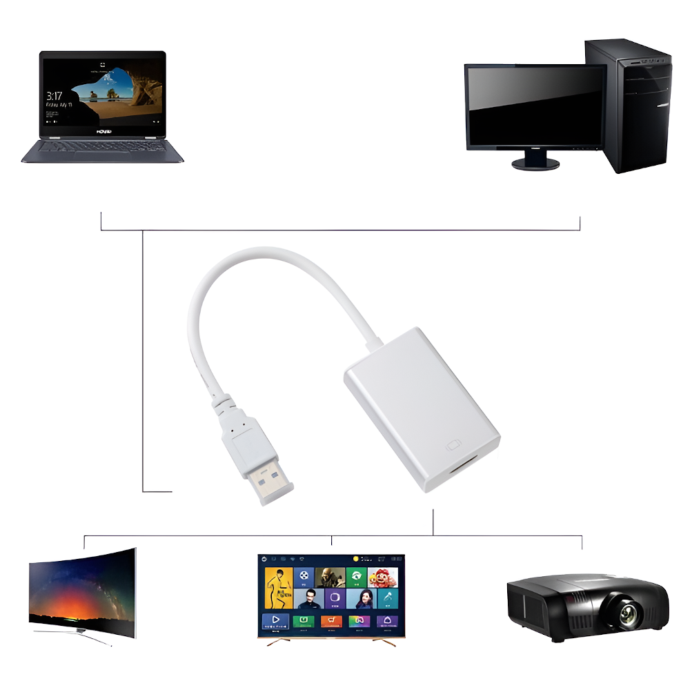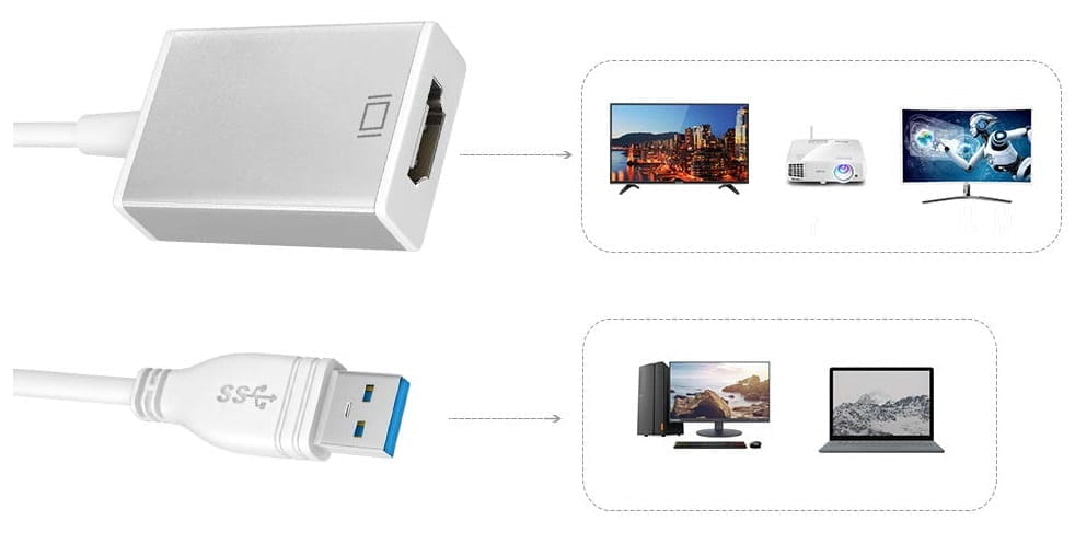 Zewnętrzna karta graficzna pod gniazdo USB 2.0 / USB 3.0 umożliwiająca podłączenie do komputera dodatkowy monitor / telewizor lub ekran wyposażony w wejście HDMI. Połączenie za pomocą gniazda USB 3.0 pozwala na przesyłanie obrazu w rozdzielczości Full HD 1920x1080. Połączenie za pomocą gniazda USB 2.0 obsługuje rozdzielczość 800x480. Konwerter posiada możliwość klonowania ekranu (screen mirroring) lub rozszerzenie ekranu (extend). Urządzenie zasilane jest z portu USB i nie wymaga dodatkowego zasilacza. W zestawie znajduje się płyta ze sterownikami.