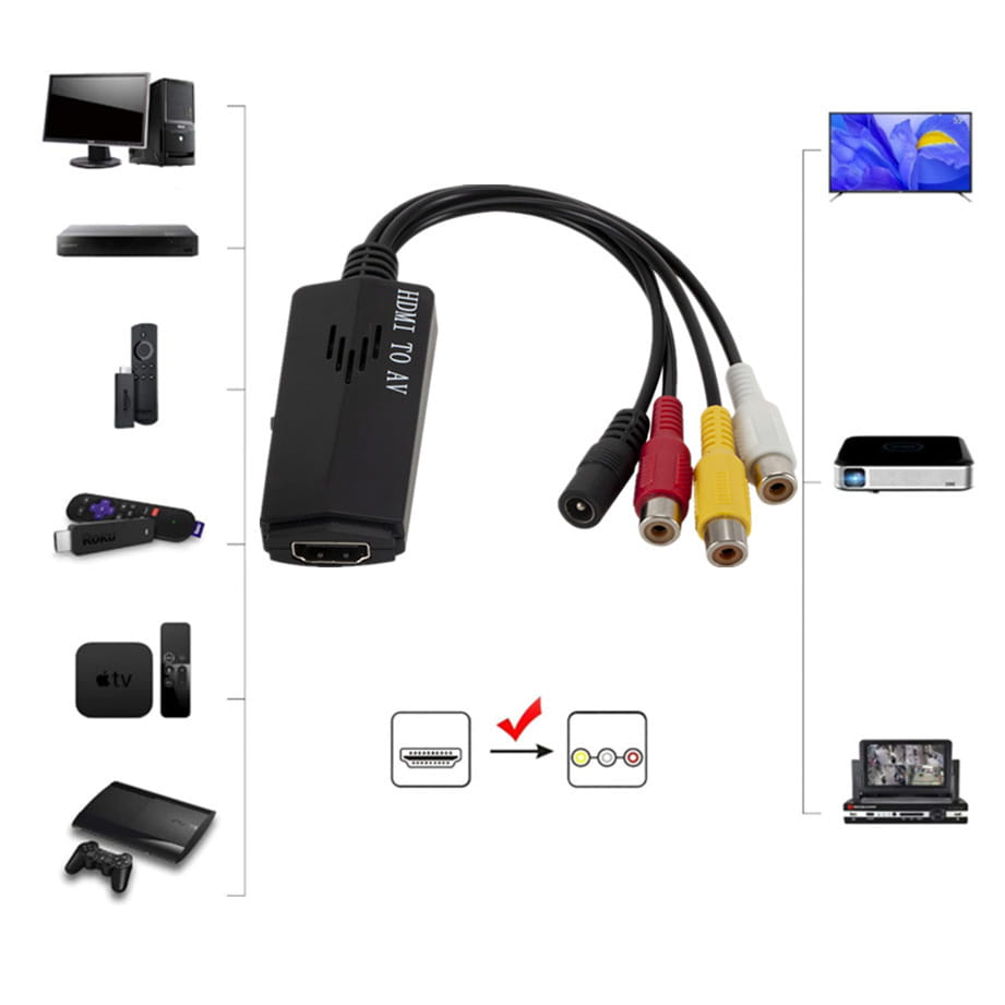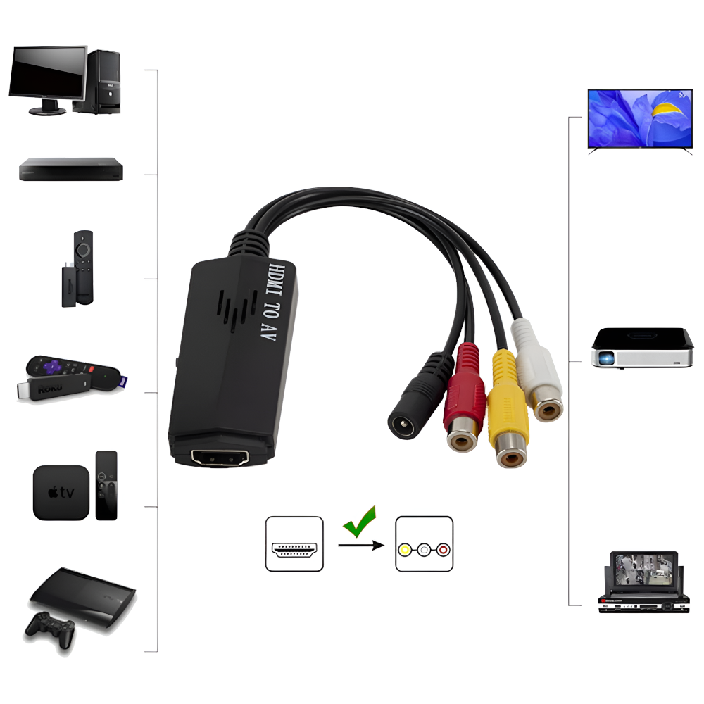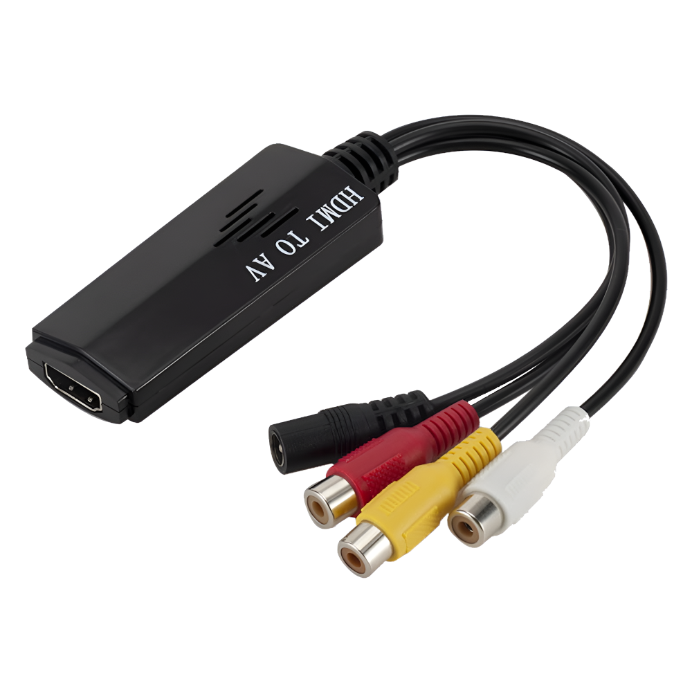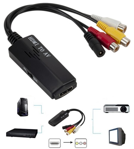 Uniwersalny konwerter HDMI na AV 3 x RCA Chinch. Konwersja wysokiej jakości sygnału audio wideo HDMI na kompozytowe audio wideo cvbs L/P 3 x RCA. Standardowa rozdzielczość oferowana przez konwerter to 480i (NTFS) i 576i (PAL). Przeznaczeniem konwertera jest łączenie nowoczesnych urządzeń z wyjściem HDMI z telewizorami, które nie posiadają takiego złącza, a nadal są sprawne. Dzięki konwerterowi starsze odbiorniki telewizyjne od nowa mogą stać się centrum rozrywki.