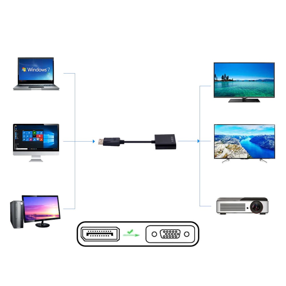 Jeżeli brakuje ci złącza VGA w komputerze wystarczy podłączyć tą przejściówkę do złącza Displayport w komputerze / laptopie i za pomocą kabla VGA podłączyć odpowiedni monitor / telewizor.