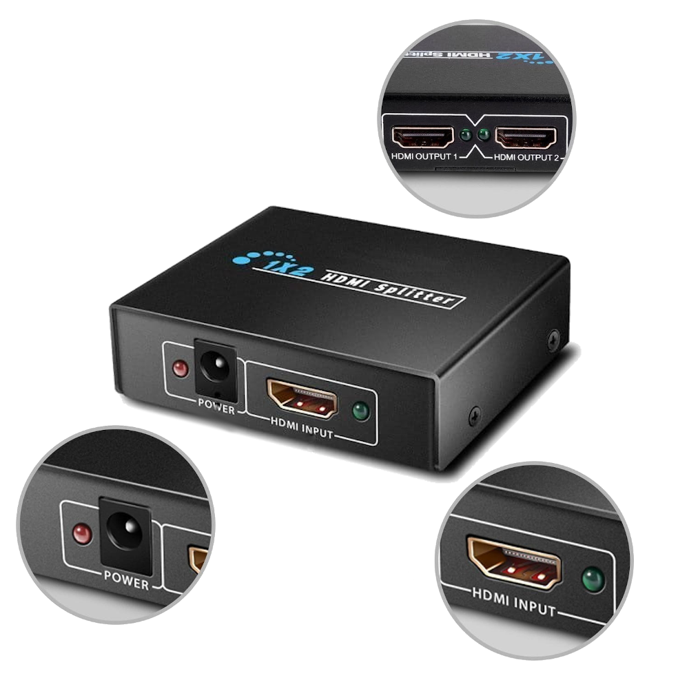 Do złącza "Input" na splitterze podłączamy komputer/laptop (urządzenie wysyłające obraz) za pomocą kabla HDMI. Następnie ze złączy oznaczonych "Output 1, 2" podłączamy monitory/telewizory (wyświetlacze) na których chcemy wyświetlać obraz.
