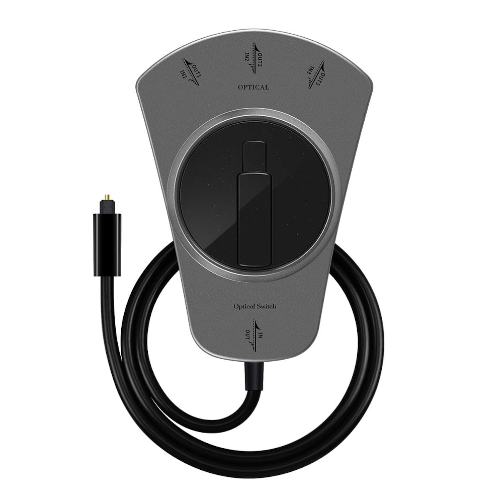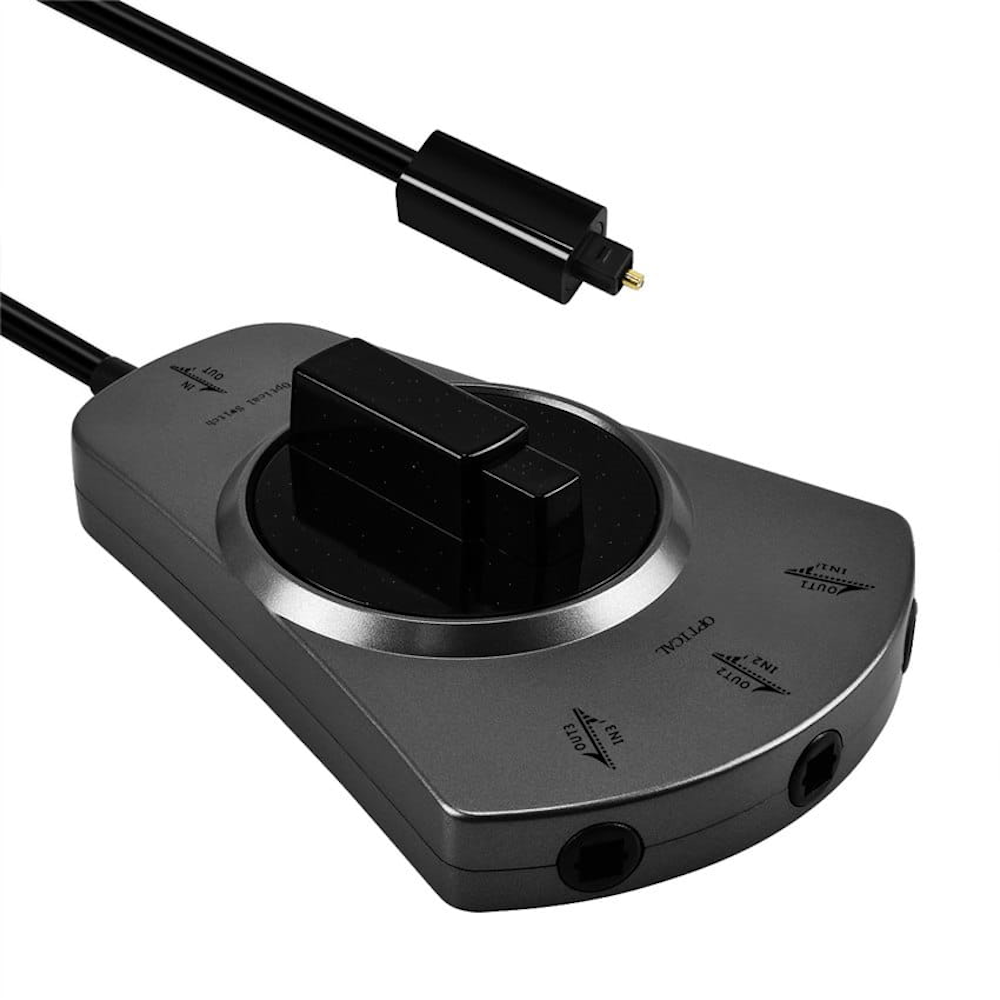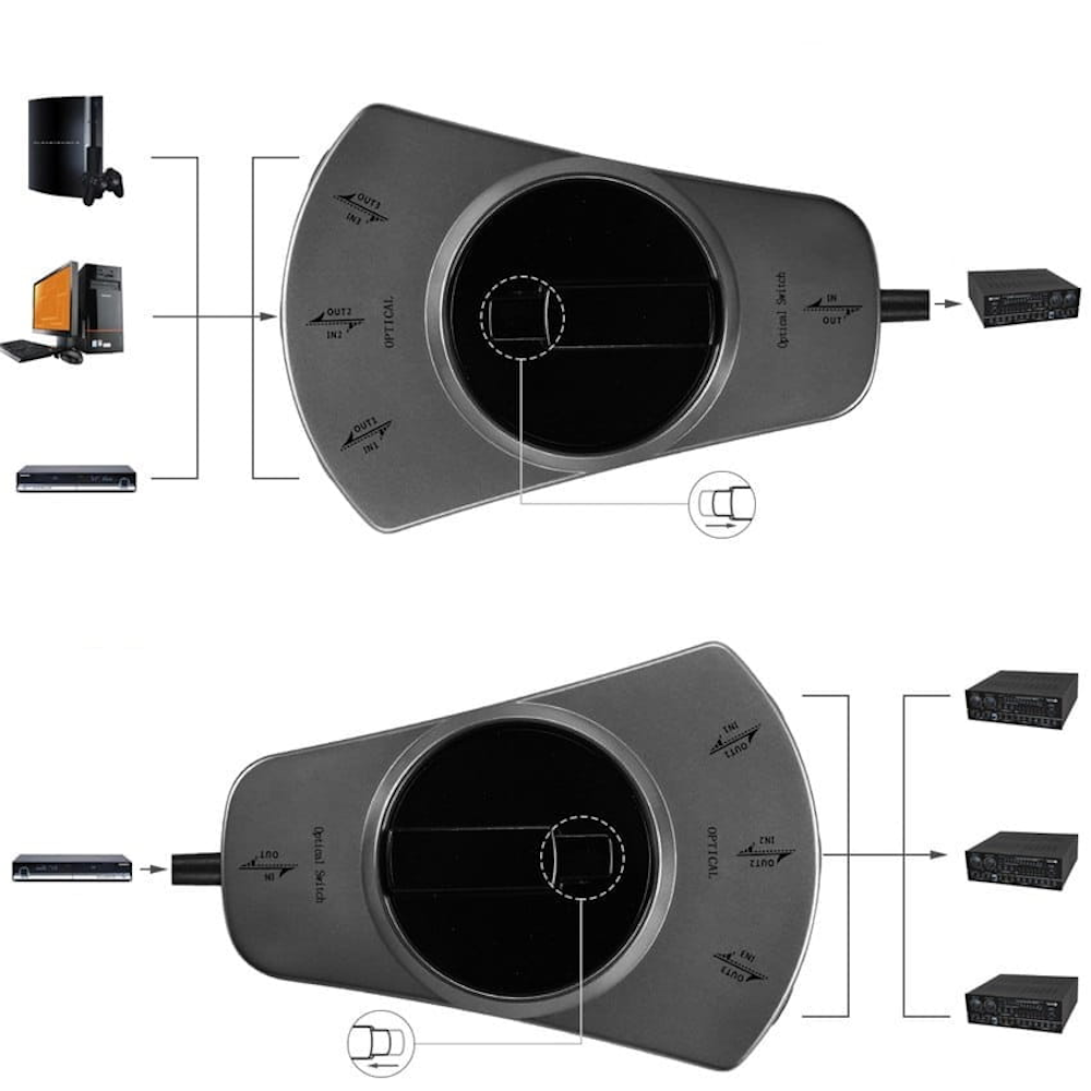 Switch Toslink to przejściówka, która może być wykorzystana na dwa sposoby, z 3 gniazd optycznych na 1 oraz z 1 gniazda optycznego na 3. Switch umożliwia wykorzystanie jednego gniazda optycznego w amplitunerze lub wzmacniaczu do podłączenia trzech źródeł sygnału. Dzięki takiemu rozwiązaniu nie trzeba odłączać delikatnych kabli, by wykorzystywać wysoką jakość połączenia optycznego. Możliwym jest podłączenie telewizora, komputera oraz konsoli do gier w jednym momencie. Za pomocą przełącznika na switchu wybiera się źródło sygnału. Istnieje też możliwość podłączenia jednego urządzenia, które będzie nadawało sygnał optyczny za pomocą kabla toslink do wejścia switcha i wybieranie źródła sygnału za pomocą pokrętła. W prosty sposób można wybierać pomiędzy sprzętem grającym oraz pomieszczeniami w których ma być odtwarzany dźwięk. Switch toslink jest prosty w użyciu i gwarantuje dłuższy okres wytrzymałości przewodów toslink, których nie trzeba wyciągać z gniazd.